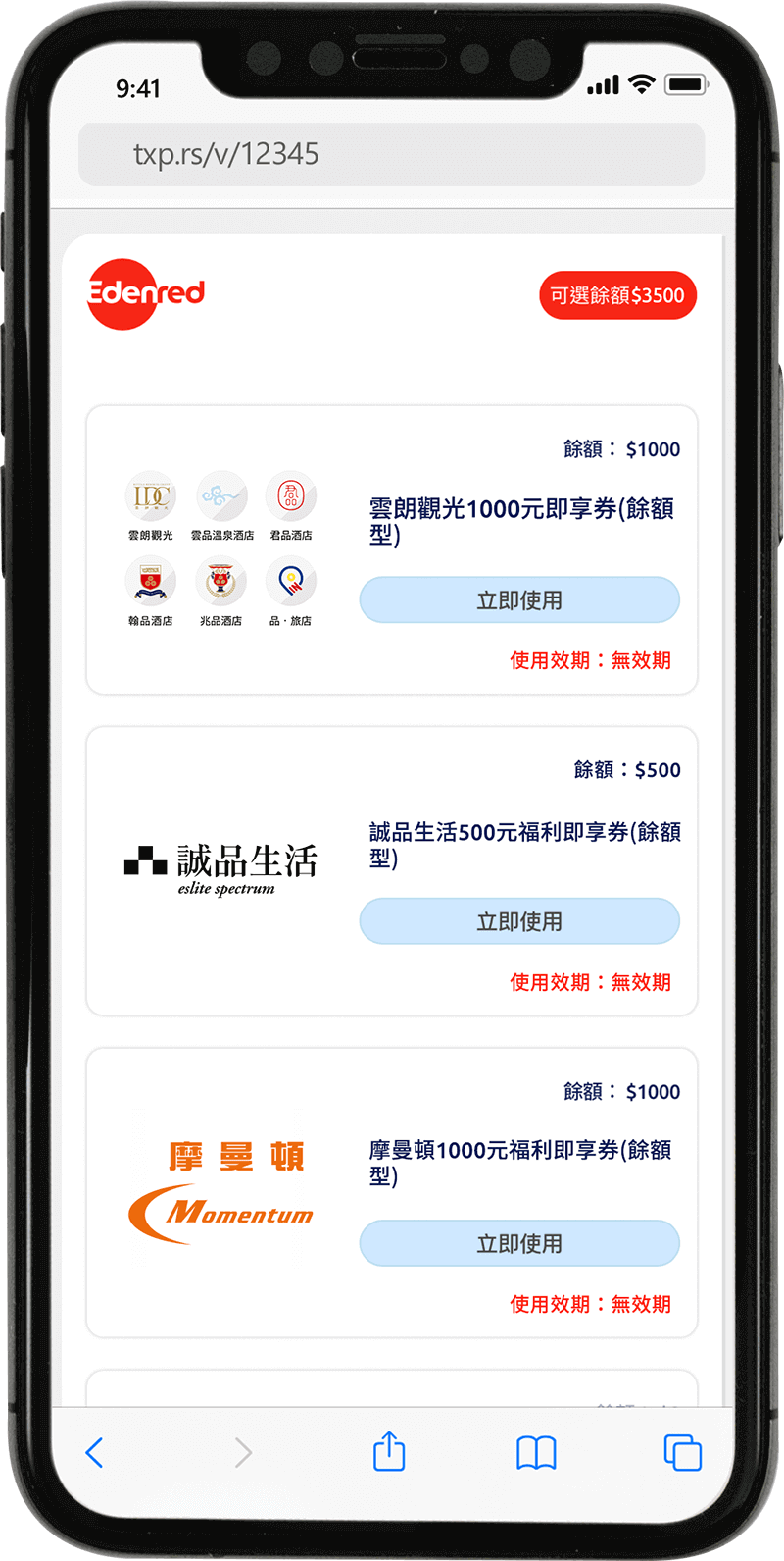 公司人資/福委決定禮券面額,員工依自己喜好在額度內搭配40種以上品牌與不同面額,組合彈性上看150種,不會有以往單一品牌實體禮券不符合需求需轉賣的困擾,福利即享券可分次使用並顯示餘額,還能存到手機電子錢包保存管理!