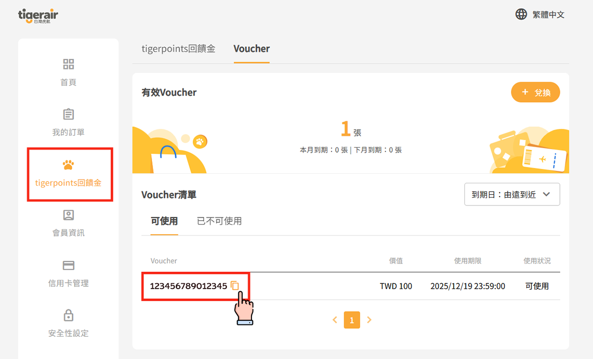 1. 前往「tigerpoints回饋金 > Voucher」頁籤檢視並取得 Voucher 序號。