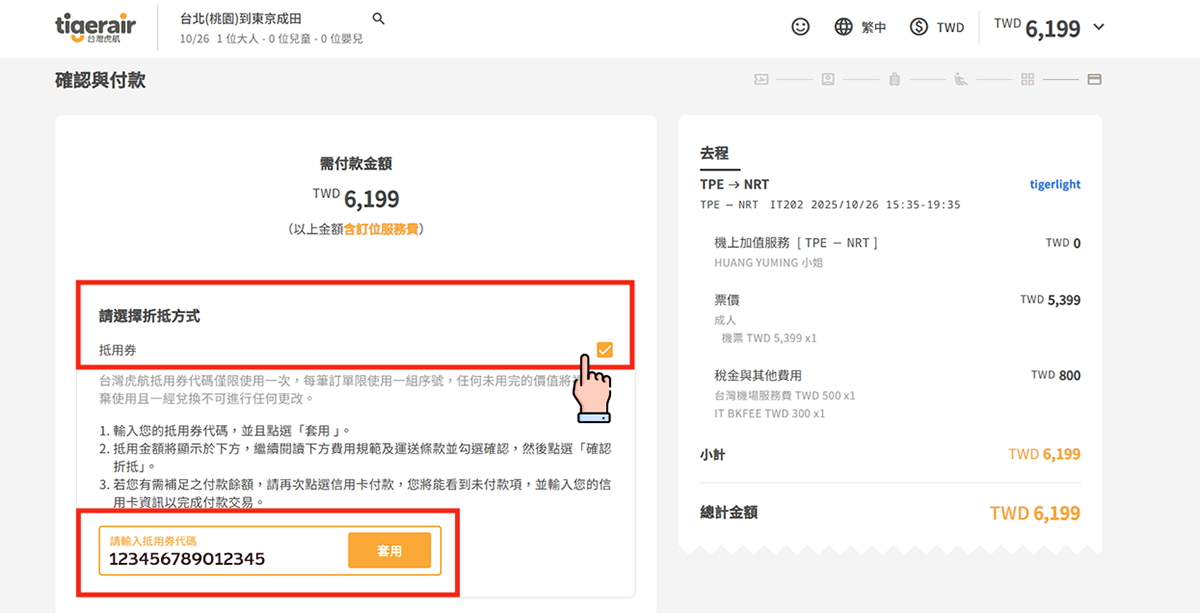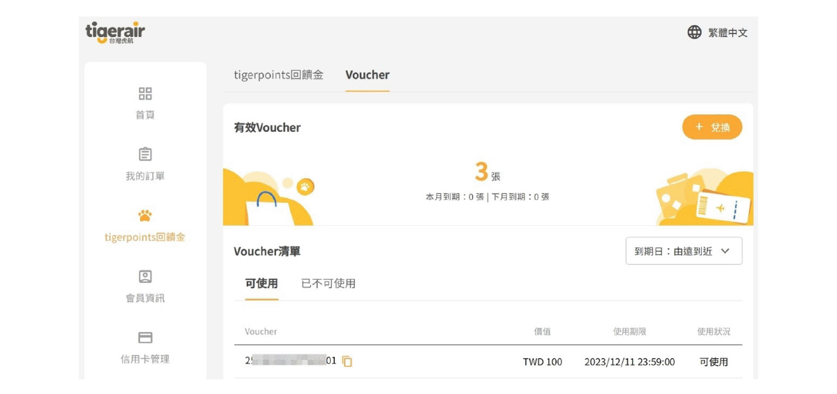 於台灣虎航官網購買機票或加值服務時,請先至會員中心”tigerpoints回饋金”複製voucher序號,並於付款頁面勾選抵用券後,輸入voucher序號進行金額抵扣,如下圖。若無出現,請重新操作或洽詢 台灣虎航客服中心接著再支付剩餘金額後即完成訂票。付款完成後,系統將寄送電子行程單至您的電子信箱。