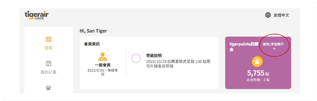 1. 會員平台左側 「tigerpoints回饋金」 可查詢點數餘額、到期日。