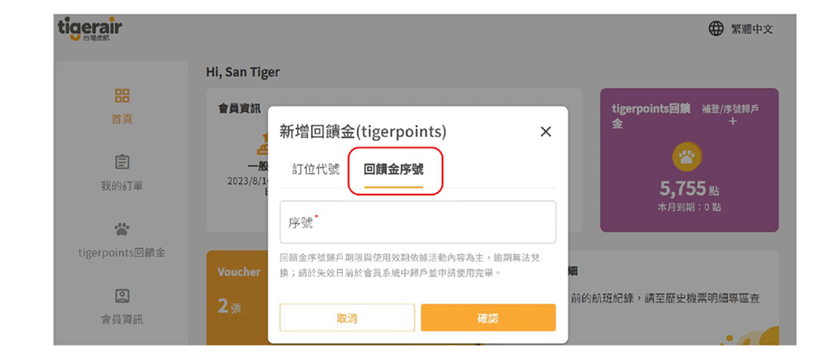 輸入即享券上「 tigerpoints回饋金序號」並點選「確認」即完成歸戶。