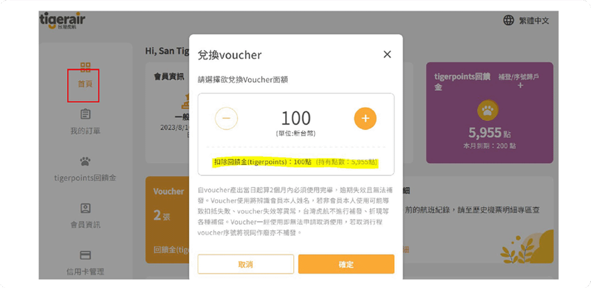 4. tigerpoints回饋金歸戶後須兌換為 Voucher 才能折抵機票或加值服務。